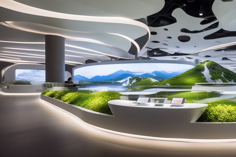 科普之道:科普之道的建筑造型采用了生態(tài)系統(tǒng)的形象,利用綠色和藍(lán)色的搭配,形成一個(gè)清新而科學(xué)的空間,象征著科普之道??破罩赖恼故痉绞街饕遣捎脛?dòng)物尋訪(fǎng)VR體驗(yàn)系統(tǒng)、鳥(niǎo)類(lèi)互動(dòng)發(fā)聲裝置系統(tǒng)、高山植物生存觸摸互動(dòng)裝置系統(tǒng)、食物鏈互動(dòng)系統(tǒng)、沉浸式生態(tài)系統(tǒng)運(yùn)行互動(dòng)系統(tǒng)等多種形式,讓參觀(guān)者可以通過(guò)虛擬現(xiàn)實(shí)、聲音模擬、觸摸反饋、互動(dòng)游戲等方式,體驗(yàn)和學(xué)習(xí)科學(xué)知識(shí)和自然教育,同時(shí)觀(guān)看介紹科普知識(shí)的沉浸式投影影片,提高科學(xué)素養(yǎng)和生態(tài)意識(shí)??破罩赖恼故緝?nèi)容主要是科學(xué)研究和自然教育,包括大熊貓國(guó)家公園的建設(shè)理念和保護(hù)措施、科研機(jī)構(gòu)和項(xiàng)目、自然教育的內(nèi)容和方法、生態(tài)系統(tǒng)的運(yùn)行和保護(hù)等??破罩赖脑O(shè)計(jì)意圖是為了展示科普之道,讓參觀(guān)者了解科學(xué)進(jìn)步和自然教育,同時(shí)培養(yǎng)參觀(guān)者的科學(xué)思維和生態(tài)行動(dòng)??破罩赖恼故痉绞降倪x擇是為了利用多種技術(shù)手段,展現(xiàn)科學(xué)的趣味和實(shí)用,同時(shí)利用沉浸式投影的視覺(jué)效果,傳遞科普的信息和知識(shí)??破罩赖恼故緝?nèi)容的目的和作用是為了讓參觀(guān)者對(duì)科學(xué)研究和自然教育有一個(gè)全面和深入的認(rèn)識(shí),同時(shí)提高參觀(guān)者的科學(xué)素養(yǎng)和生態(tài)意識(shí)。