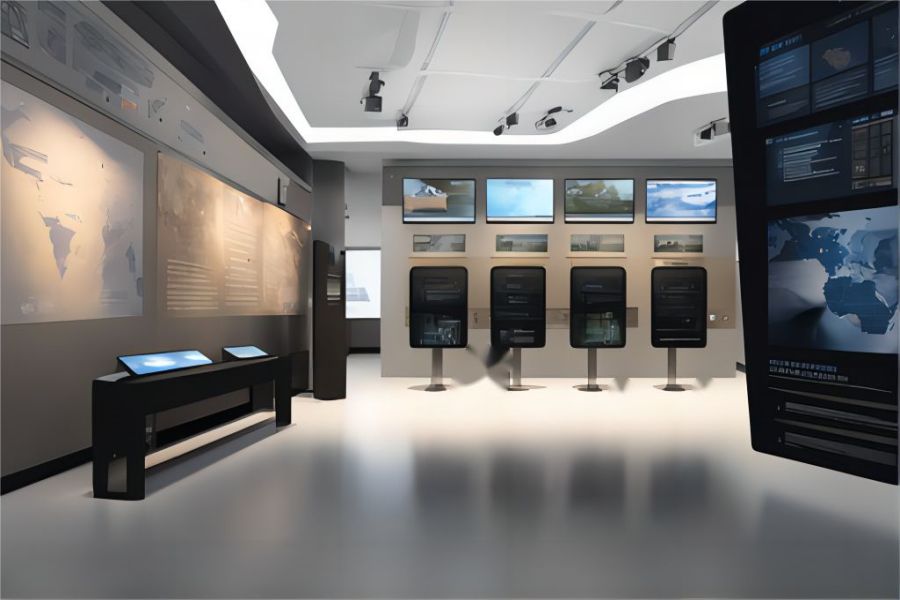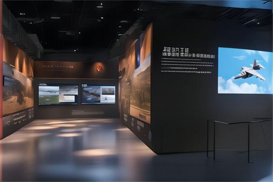 - 特效屏幕:通過高清投影儀將不同的場景投射在屏幕上,通過聲光電等特效技術(shù),營造出逼真的氛圍和效果,讓參觀者仿佛置身于其中。該設(shè)備名為《人民戰(zhàn)爭》,意在讓參觀者感受人民在不同歷史時(shí)期和不同事件中所表現(xiàn)出的英勇無畏和堅(jiān)強(qiáng)不屈。