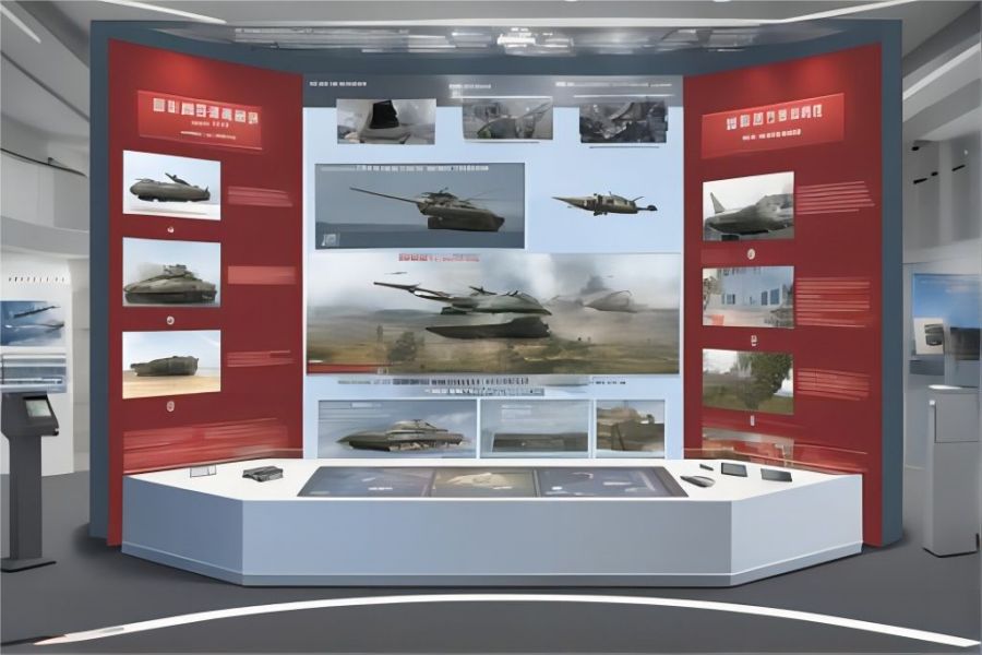 - 互動(dòng)滑軌屏:通過滑動(dòng)屏幕可以查看不同的圖片、視頻、文字等,展示人民在抗日戰(zhàn)爭、抗美援朝、自衛(wèi)反擊、汶川地震、南海仲裁等事件中所做出的貢獻(xiàn)和犧牲。該設(shè)備名為《鐵血忠魂》,意在讓參觀者了解人民在國防和人防中所發(fā)揮的重要作用和偉大力量。