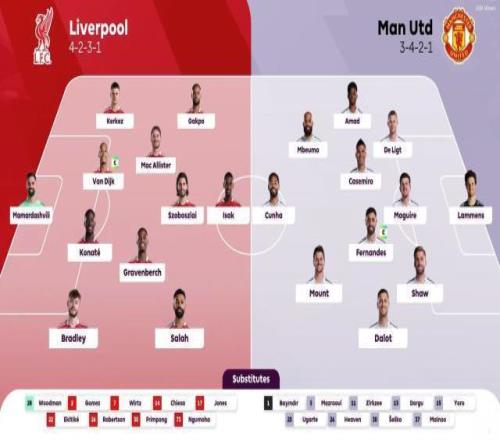 利物浦首發:馬馬爾達什維利、范戴克、科納特、凱爾凱茲、索博斯洛伊、伊薩克、麥卡利斯特、薩拉赫、布拉徳利、哈克波、赫拉芬貝赫