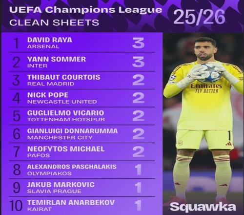Squawka統計,拉亞和索默爾在本賽季歐冠比賽中3場比賽全部完成零封,阿森納和國米門將也是僅有的本賽季歐冠尚未失球的門將。