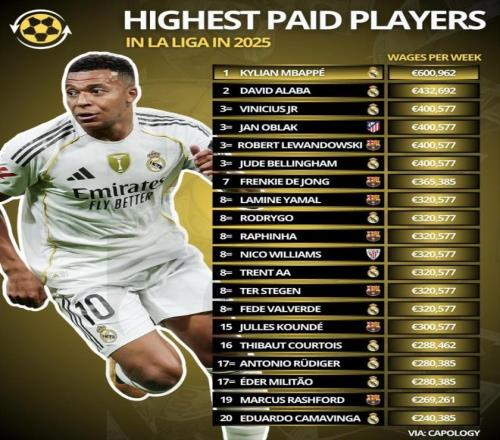 最近球員公司(Capology)發(fā)布了西甲球員周薪榜:姆巴佩領(lǐng)跑,較第二名高約38.9%;皇馬上榜11人、巴薩7人,馬競與畢爾巴鄂各1人。榜單直觀看到皇馬在頂薪段占主動(dòng),形成“頂薪+核心平臺(tái)”的梯度;巴薩更多押在32萬歐元/周的平臺(tái)上,卻要同時(shí)扛住老將高薪與新星提價(jià)的拉扯——這套薪資結(jié)構(gòu)更穩(wěn),還是更難續(xù)?下面就按俱樂部拆開聊。