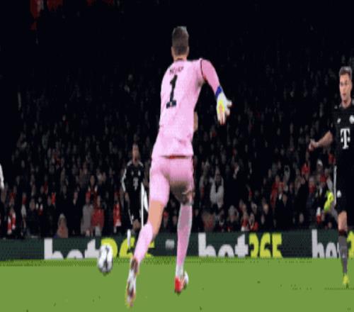 第9分鐘,諾伊爾的傳球直接被薩利巴截斷,但薩利巴展現了后衛的腳法,又把球傳了回去。