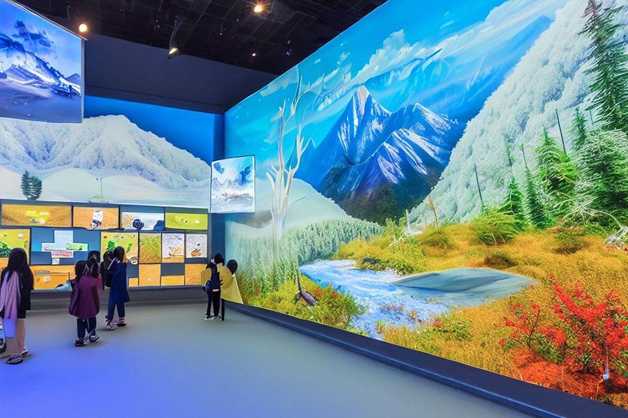 大自然展區(qū):利用大型屏幕和沉浸式投影技術(shù),模擬了不同地域和季節(jié)的自然景觀,如雪山、沙漠、森林、海洋等。中小學(xué)生可以通過觸摸屏幕或語音控制來切換不同的場(chǎng)景,并通過虛擬現(xiàn)實(shí)眼鏡來體驗(yàn)不同的視角。同時(shí),展區(qū)還提供了一些與自然相關(guān)的互動(dòng)游戲和知識(shí)問答,如識(shí)別動(dòng)植物、模擬天氣變化、測(cè)量地震強(qiáng)度等。