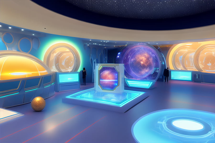 宇宙展區(qū):利用球幕影院和全息投影技術(shù),展示了宇宙中各種壯觀而神秘的景象和現(xiàn)象,如星系、行星、黑洞、彗星等。中小學(xué)生可以通過觸摸屏幕或語音控制來選擇不同的星體,并通過虛擬現(xiàn)實(shí)眼鏡來體驗(yàn)不同的視角。同時(shí),展區(qū)還提供了一些與宇宙相關(guān)的互動(dòng)游戲和知識(shí)問答,如探測(cè)火星、發(fā)射火箭、計(jì)算太陽系年齡等。