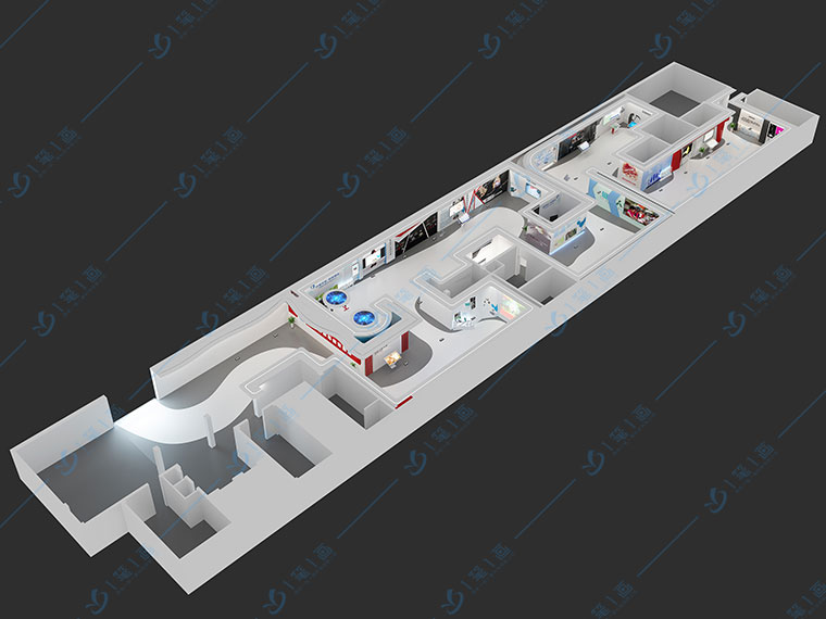 在結(jié)構(gòu)設(shè)計中,平面與特殊形狀的結(jié)合,呈現(xiàn)出優(yōu)美的視覺效果。為了使展廳具有科技感,有時會在燈光設(shè)置上采用暗場+燈光效果。根據(jù)展廳大小,設(shè)置合適的過道大小和數(shù)字化設(shè)備數(shù)量。