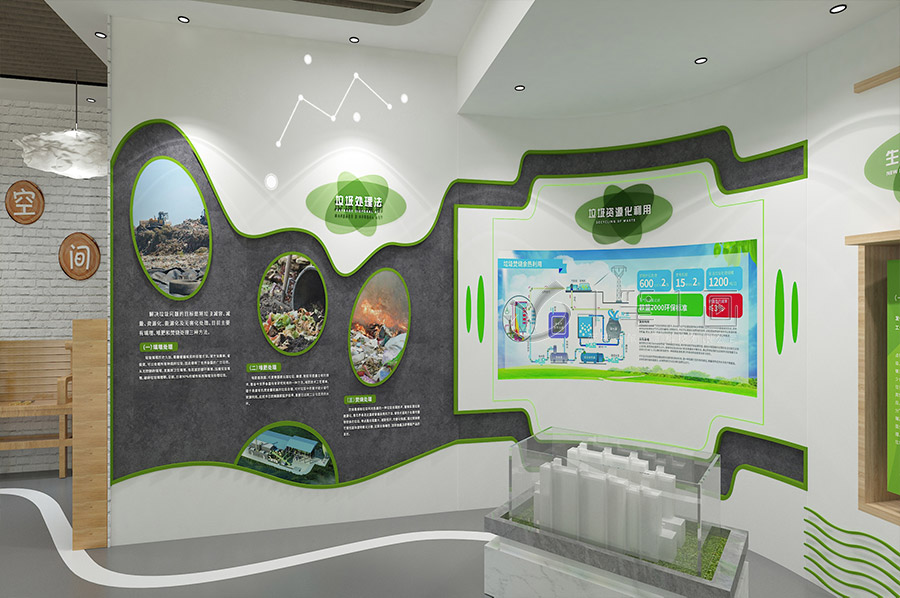 新時尚體驗(yàn)區(qū):該區(qū)域位于展廳的后部,主要展示垃圾分類工作的意義和價值,以及垃圾分類工作對市民生活的影響和改善,包括垃圾分類工作的社會效益、經(jīng)濟(jì)效益、環(huán)境效益等,以及垃圾分類工作的未來展望和目標(biāo),如打造生態(tài)之城、推動綠色發(fā)展、實(shí)現(xiàn)垃圾無害化、減量化、資源化等,展現(xiàn)垃圾分類工作的深遠(yuǎn)意義和前瞻性,以及垃圾分類工作的責(zé)任和擔(dān)當(dāng)。該區(qū)域的設(shè)計(jì)元素主要是當(dāng)?shù)氐淖匀痪坝^和文化氣息,如綠色植物、清新空氣、美麗河岸、和平公園、科普館等,以及垃圾分類的相關(guān)文化和藝術(shù),如垃圾分類的詩歌、歌曲、畫作、雕塑等,營造出一種優(yōu)美而和諧的氛圍。