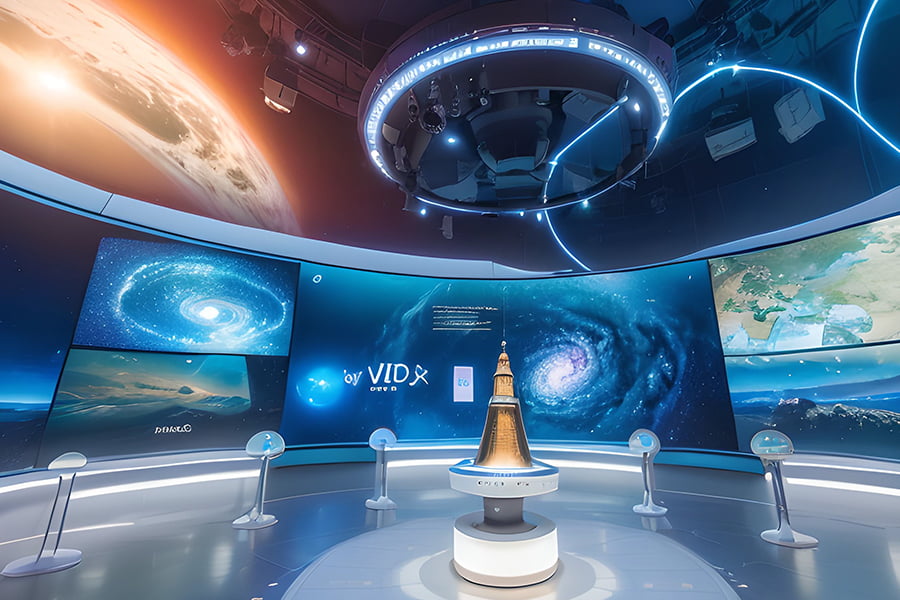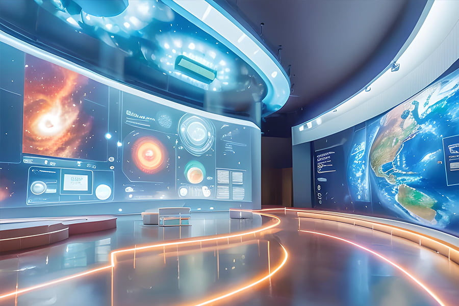 科學之門:建筑造型圓形的穹頂,象征著科學的完美和無限。穹頂?shù)膬?nèi)部覆蓋了LED屏幕,可以播放不同的科學主題的影像,如宇宙、生命、物理、化學等,配合音樂和燈光,營造出一個科幻的空間隧道。穹頂?shù)娜肟谔幵O(shè)有一個大型的觸控屏,可以讓參觀者選擇自己感興趣的科學主題,定制自己的科學之旅。穹頂?shù)某隹谔幵O(shè)有一個大型的LOGO墻,上面寫著“科學之美,智慧之城”,寓意著參觀者即將進入一個充滿科學和智慧的城市。該區(qū)域的展示內(nèi)容的目的和作用是引導參觀者進入科學的世界,激發(fā)他們的好奇心和期待感,為他們展開一場科學之旅。